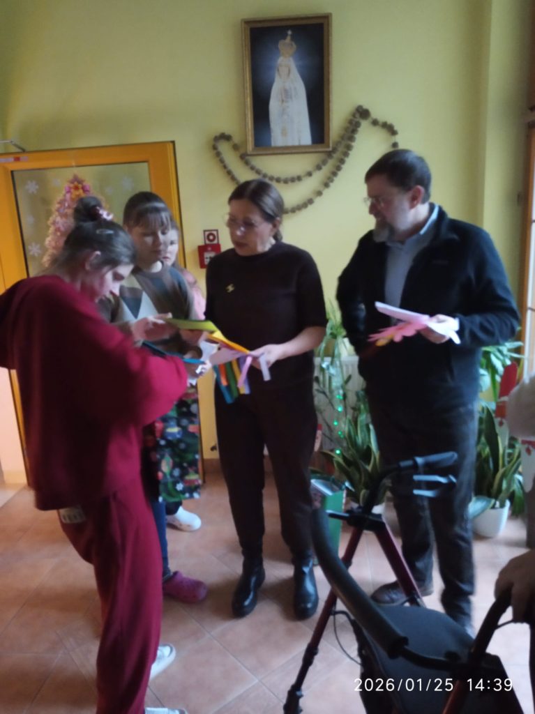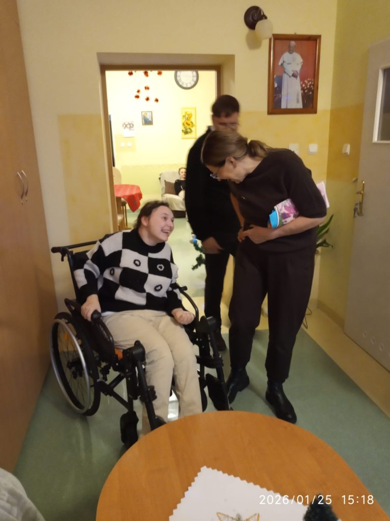Niedziela, 25 stycznia, była dla naszej społeczności dniem szczególnym, wypełnionym radością i dowodami ludzkiej solidarności. Gościliśmy w naszych progach Barbarę i Macieja z Krzywinia – wolontariuszy Fundacji Małych Stópek, którzy przybyli do nas nie tylko z dobrym słowem, ale i z ogromnym wsparciem materialnym, będącym owocem zbiórek przeprowadzonych wśród lokalnej społeczności w ramach akcji „Paczuszka dla maluszka”, która prowadzona jest co roku w okolicach Świąt Bożego Narodzenia . Z wdzięcznością przyjęłyśmy liczne paczki z darami. Jesteśmy pod ogromnym wrażeniem zaangażowania wielu środowisk, które odpowiedziały na apel wolontariuszy Fundacji Małych Stópek. Szczególne podziękowania kierujemy do: Duszpasterzy i wiernych z: – Parafii pw. św. Andrzeja w Wyskoci – Parafii pw. św. Kazimierza w Jerce – Parafii pw. św. Katarzyny Sieneńskiej w Choryni, – Parafii pw. św. Mikołaja w Krzywiniu Właścicieli i klientów: – Zakładu fryzjerskiego pani Moniki Kasperskiej w Krzywiniu – Salonu kosmetycznego Vita Kosmetyka w Krzywiniu – Zakładu fryzjerskiego pani Adrianny Kuczmy w Krzywiniu, którzy wykazali się niezwykłą empatią, organizując zbiórkę w swoich lokalach. Przekazane artykuły są dla nas realnym wsparciem w codziennym funkcjonowaniu, a fakt, że tyle osób zaangażowało się w pomoc, jest dla nas ogromnym wsparciem moralnym. Spotkanie miało bardzo podniosły, a zarazem domowy charakter. Rozpoczęliśmy je od spotkania wolontariuszy z mieszkankami naszego Domu, wolontariusze poświęcili czas każdej z mieszkanek, wysłuchując ich historii i dzieląc się własnym entuzjazmem. Następnie w naszej kaplicy wspólnie odmówiliśmy dziesiątkę różańca. Modlitwa ta była wyrazem naszej wdzięczności – polecaliśmy Bogu wszystkich ofiarodawców, prosząc o potrzebne dla nich łaski w podziękowaniu za ich otwarte serca. Na zakończenie w świetlicy przygotowano wspólną kawę i słodki poczęstunek. Dzięki kreatywności gości, nasze mieszkanki mogły wziąć udział w zabawach, które wywołały mnóstwo śmiechu i pozytywnej energii. Zapraszamy wszystkich Państwa, darczyńców oraz przyjaciół naszego Domu, do obejrzenia pełnej relacji zdjęciowej, fotografie te najlepiej oddają atmosferę tego wyjątkowego dnia i radość, jaka zapanowała w naszych progach. Takie dni przypominają nam, że DPS to nie tylko miejsce opieki, ale przede wszystkim wspólnota, o której pamiętają ludzie o dobrych sercach. Wizyta wolontariuszy pozostawiła w naszych sercach wiele ciepła. Cieszymy się, że nasz Dom stał się miejscem spotkania tylu życzliwych osób. Składamy serdeczne „Bóg zapłać” wszystkim darczyńcom oraz wolontariuszom za ich obecność, poświęcony czas i każdy gest dobroci. Zapewniamy o naszej modlitwie, każdego miesiąca odprawiana jest Msza św. za naszych dobrodziejów i ofiarodawców.